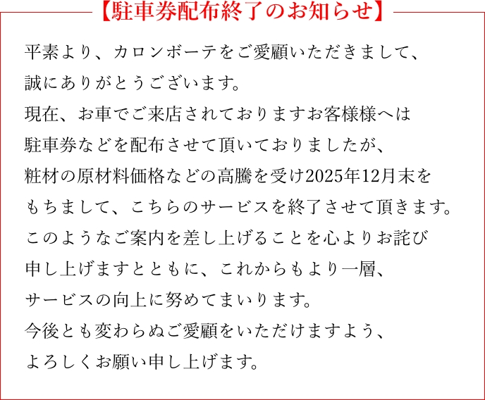 お車でお越しの方:お車でお越しの方:近隣に当店契約駐車場をご用意しております。各パーキングの精算機で駐車券もしくは駐車証明書を発行してご持参下さい。